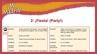Charlie and Quique prepare for a birthday party. Sofía tells them a story about ¡La Tomatina! - the annual tomato festival which takes place in the Valencian town of Buñol every August. Uncle Manu sings a song to celebrate ¡La Fiesta! Key vocabulary includes numbers and dates and the question words ¿cuándo?, ¿cuánto? and ¿por qué?