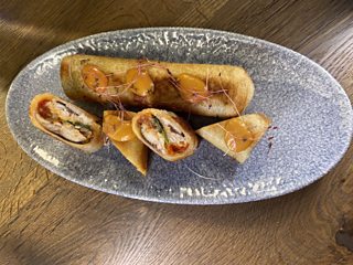 Spoon or place in a squeezy bottle and pipe onto the piece and garnish with coriander or microherbs.