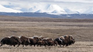 There's something intrinsically haunting about the sound of howling, especially on Ellesmere Island, surrounded by wolves. Mimicking the howls subtly helps us associate the music with the wolves and the weather. This becomes a useful tool when we want to give a sense of danger or presence of wolves even if there is none on screen. But there are other dangers out there too, like the huge prehistoric-looking muskoxen.