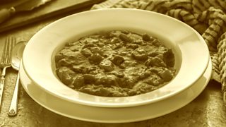 Sean is giving his recipe for Irish stew. Janet is correcting him as he goes.