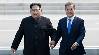 Newyddion yn cynnwys Arweinydd Gogledd Corea, Kim Jong-un, yn croesi'r ffin i Dde Corea.