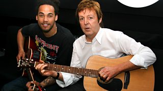 Dev get's a guitar lesson from former 'Beatle' Paul McCartney.