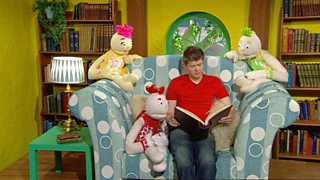 Jack reads a story to his puppet friends in the Gingerbread House.