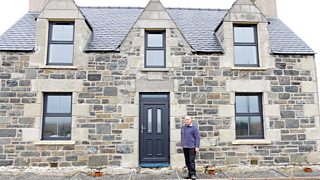 Calum Aonghas MacAoidh a' coimhead ri mar a leasaicheas sinn seann taighean.