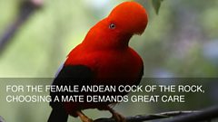 Miranda Krestovnikoff presents the Andean Cock-of-the-rock from Peru. Deep in a cloud forest a female awaits the display of her displaying males. Gathered in front of her several head-bobbing wing-waving males, these males are spectacularly dazzling; a vibrant orange head and body, with black wings and tails, yellow staring eyes, and ostentatious fan-shaped crests which can almost obscure their beaks. Male cock-of-the rocks gather at communal leks, and their performances include jumping between branches and bowing at each other whilst all the time calling loudly. Yet, for all the males' prancing and posturing, it is the female who's in control. Aware that the most dominant and fittest males will be nearest the centre of the lekking arena, it's here that she focuses her attention.