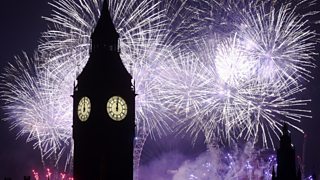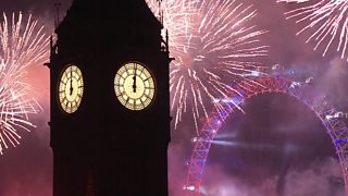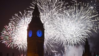 Coverage of London's spectacular fireworks display on the River Thames as Big Ben strikes midnight and crowds gather to welcome in the new year.