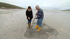 The beach, which is used as an airport several times a day also happens to be one of the most productive Cockle beaches in the islands. Donald Maclean, who runs a shellfish company on the island, gives Sarah a lesson in Cockling.