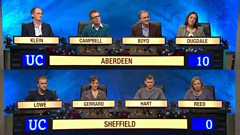 It is the penultimate first-round match and both teams are doing battle for a place in the semis. They are the University of Aberdeen, with broadcaster Nicky Campbell and Kezia Dugdale, leader of the Scottish Labour Party, and Sheffield University, with science presenter Adam Hart and Nicci Gerrard, the thriller writer better known as Nicci French.