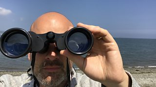 Gyda'i sbienddrych yn ei law, mae Aled yn mynd i wylio adar yng nghwmni Alwyn Evans.