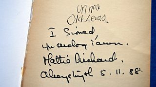 Karen Owen yn sgwrsio gyda Mair Jenkin Jones, gweddw Elis Gwyn a Manon Gwyn, ei ferch.