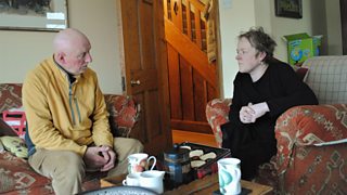Karen Owen yn sgwrsio gyda John Llywelyn Williams, mab J.O. Williams, gwrthrych y rhaglen.