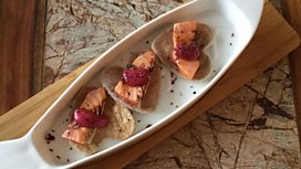 Quince cured salmon with crispbreads and spiced beetroot dressing