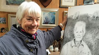Nì Fraoch Nic an Deòir dealbh dubh is geal den dà ibhear Uibhisteach Don Mac a'Phì. Heather Dewar draws a charcoal portrait of Uist diver Don MacPhee.