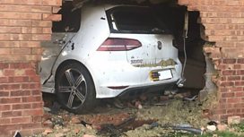 A car smashes though a brick wall into a living room, leaving 4 people injured.
