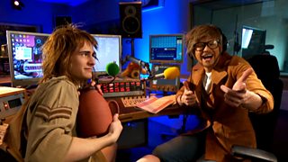 Chuck the Explorer visits Clarence Ceolmhòr in his radio studio.