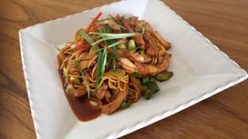 Korean spiced chicken and sweet and sour noodles.