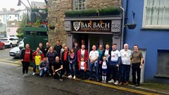 Dylan Jones a'r criw yng nghanol y cefnogwyr yng Nghaffi Maes, Caernarfon, yn edrych mlaen at rownd derfynol Cynghrair y Pencampwyr rhwng Tottenham Hotspur a Lerpwl.