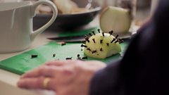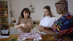 The second family to invite Andi to share their seasonal celebratory meal are the Chaudhrys. Hashim and his wife Atika live with his mum Farkhanda and his dad Masud. They’re Muslims of Pakistani heritage but true Glaswegians, or in Hash’s words 'GlaswegAsians', who love to celebrate along with the rest of the city at this time of year. A family feast at the Chaudhrys is a big affair which always sees Farkhanda and Atika preparing a range of salads, curries and meat dishes – two of which Andi gets stuck into to help get it on the table. Dishes include Farkhanda's shoe kebabs, named because the patties of minced chicken are shaped to resemble shoes.