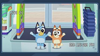 At the chemist, Bluey, Bingo and their friends have fun playing with the CCTV screens.