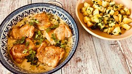 Chicken sauté with creamy leek and cheese sauce, wild garlic buttered parmentier potatoes