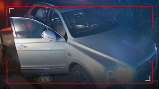 22/50 The moment a gang of thieves crash a keyless luxury vehicle after signal hacking into it.