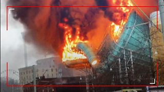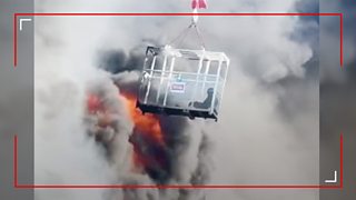 8/50 A crane worker lifts a man to safety from a burning high-rise building.