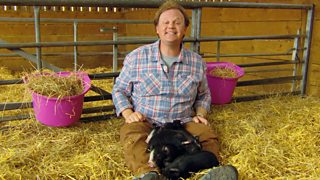 Justin and his friends are on the farm cleaning a very muddy pig.