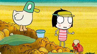 Sarah and Duck decide to spend a day at the beach and plan to build some sand animals.