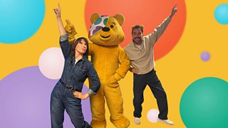 19/33 Cyflwynwyr Cyw a chriw yr Urdd yn ymuno â Trystan ac Emma ar gyfer her Plant Mewn Angen.