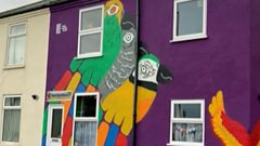 Purple Gorleston house painted with parrot murals