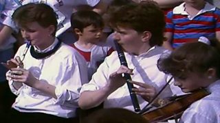 A jig and reel performed by the Sean Nugent Junior Ceilidh Band at the 1987 festival of Irish traditional music in County Tyrone.