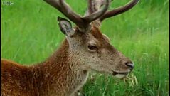 Fallow deer are resting under a shrub with a smaller one just tucked into the grass. Gordon Buchanan thinks it's a mother with a fawn but either the mother's pure white, or it's a fallow deer that's hanging out with a goat or a sheep! When it stands up, it's clearly a white one - an albino fallow deer. Gordon has never seen one before. Fallow deer are not indigenous to Mull - they were introduced here. There used to be some of the woodland here but Gordon hasn't seen them for years so it's quite nice to just come across them like this.