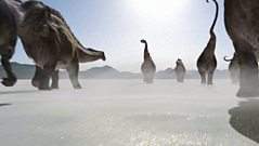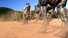 Young Allosaurus have to learn to fight for themselves very fast and even at a tiny size they are just as likely to be the hunters as the hunted. A pair of predatory Ornitholestes watches the brood, wating for their chance. The mother Allosaurus is 50 times their weight, so they will not venture too close while she is present. However the smell of all these new hatchlings will soon attract other, larger predators, so eventually the mother decides it is time to lead her unruly brood away. Al's new home is a vast floodplain that will eventually become the Badlands of Wyoming. But for now it is covered in lush conifer forest. Dinosaurs share this land with a host of other animals, including amphibians and insects. It is the insects that the infant Allosaurus are after. Born with sharp little teeth, Al is ready for his first meal. But even small prey requires skill to catch. They are liable to fly away or - worse still - stand and fight. The babies practise on a scorpion and some damselflies with varying degrees of success - the hatchlings still have a lot to learn.