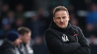 Woking boss Neil Ardley speaks to Tom Mitchell after their 1-0 defeat at Boreham Wood.
