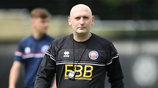 Assistant manager Hugo Langton speaks to Rob Worrall after defeat at Carlisle.