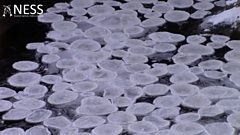 Ice pancakes float along a river in the Highlands