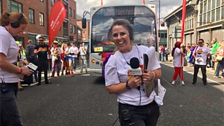 Chelsea Norris and Jason Hardy broadcast live from the Manchester Pride Parade.