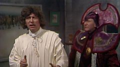 The Doctor is made president of the Time Lords. He immediately orders K-9 to lower the planet's defences and has Leela banished to the wilderness.