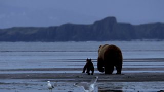 At the Falls, we meet Kali and her three cubs. Here there are lots of fish, but also lots of males to contend with. Despite being surrounded by fish, she is starving. Will she outsmart the big males?