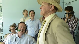Prime Minister David Cameron encounters Geoffrey Boycott in the TMS commentary box.
