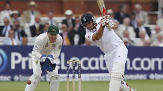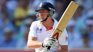 England's Ian Bell is out for 74 hitting Chris Rogers to mid-wicket.