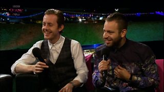 Greg James and Jen Long talk to Foals in the Tree House at the Reading Festival