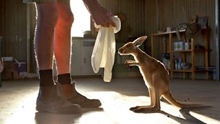 Imitating a mother kangaroo, Brolga passes his saliva to joeys in his care, to hydrate and help bonding. He teaches the joeys everything their mothers would have taught them.