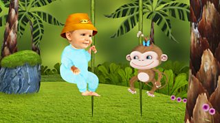 Baby Jake and Sydney the Monkey go on a tropical adventure and play copying.