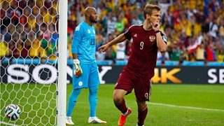 Russia's Aleksandr Kokorin scores the opening goal against Algeria inside six minutes.