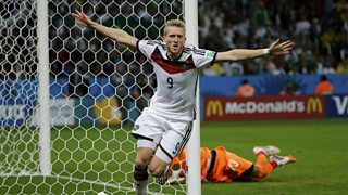 Germany's Andre Schurrle scores the opening goal two minutes in to ET against Algeria.