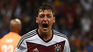 Mesut Özil scores Germany's second goal in extra time to secure victory over Algeria.