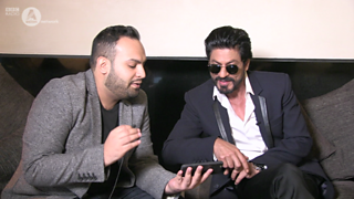 King Khan & Entertainment Reporter Haroon Rashid do the English version of Jabra Fan.