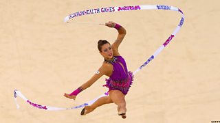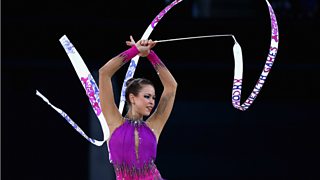 Francesca Jones, of Wales, wins gold in the ribbon rhythmic gymnastics discipline.
