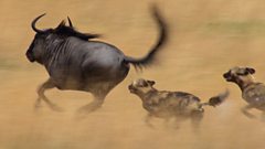 Wild dogs hunt wildebeest